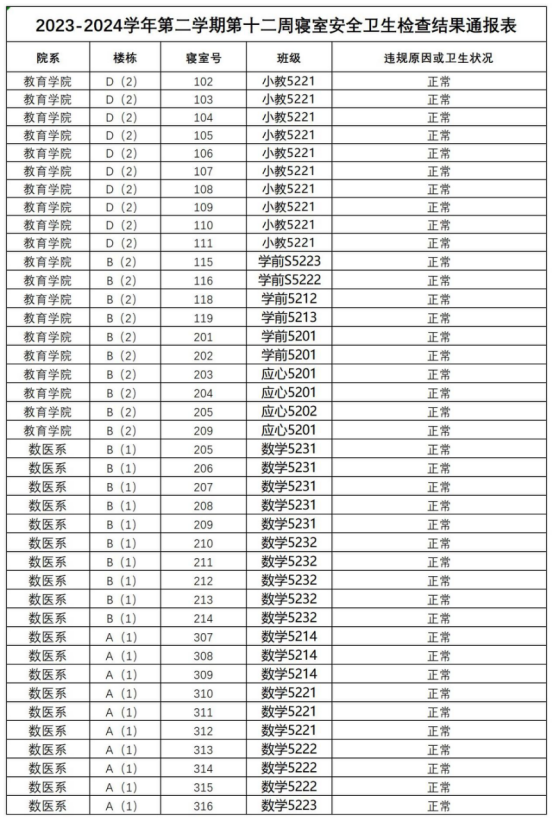 2023-2024学年第二学期第十二周寝室安全卫生检查结果通报