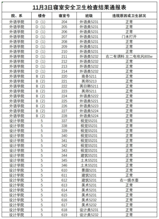 2023-2024学年第一学期第十周寝室安全卫生检查结果通报