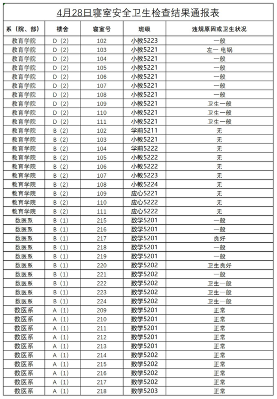 2022-2023学年第二学期第十一周寝室安全卫生检查结果通报