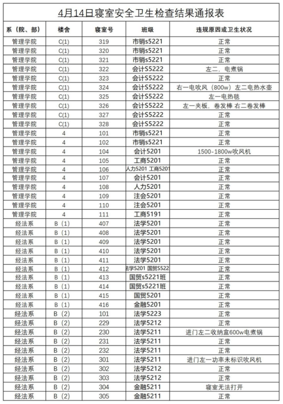2022-2023学年第二学期第九周寝室安全卫生抽查结果通报