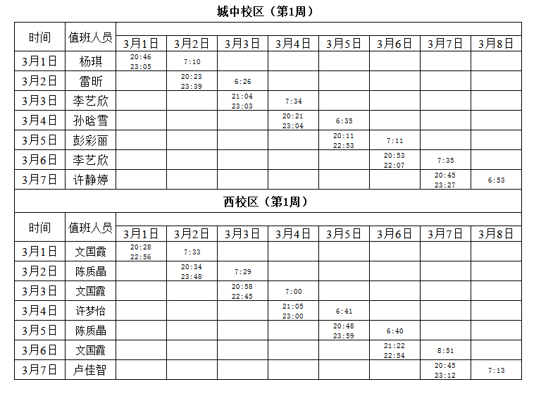 2020-2021学年第二学期第1周学工人员寝室值班通报