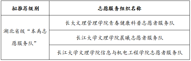 根据《湖北省“本禹志愿服务队”创建活动管理办法(修订)》要求,经自主申报、资格审查、组织评审等环节,经校团委、校志愿服务总队研究决定,报分管领导确定,拟推荐长大文理bw必威西汉姆联官方网站青春健康科普志愿者服务队等3个志愿服务组织参与2023年度省级“本禹志愿服务队”评选。具体名单公示如下(以下排名不分先后):