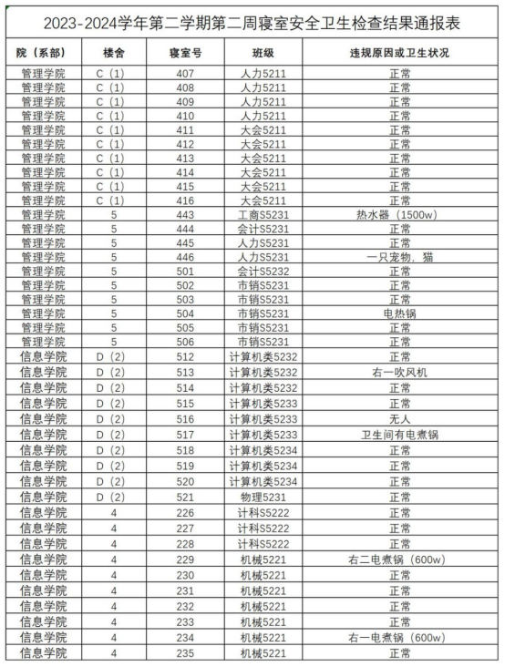 2023-2024学年第二学期第二周寝室安全卫生检查结果通报