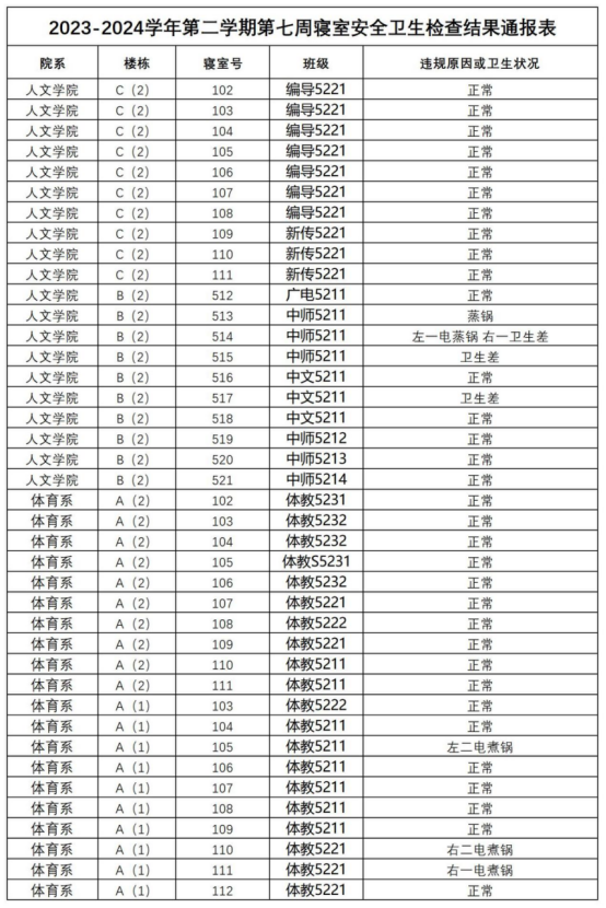 2023-2024学年第二学期第七周寝室安全卫生检查结果通报