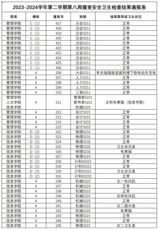 2023-2024学年第二学期第八周寝室安全卫生检查结果通报