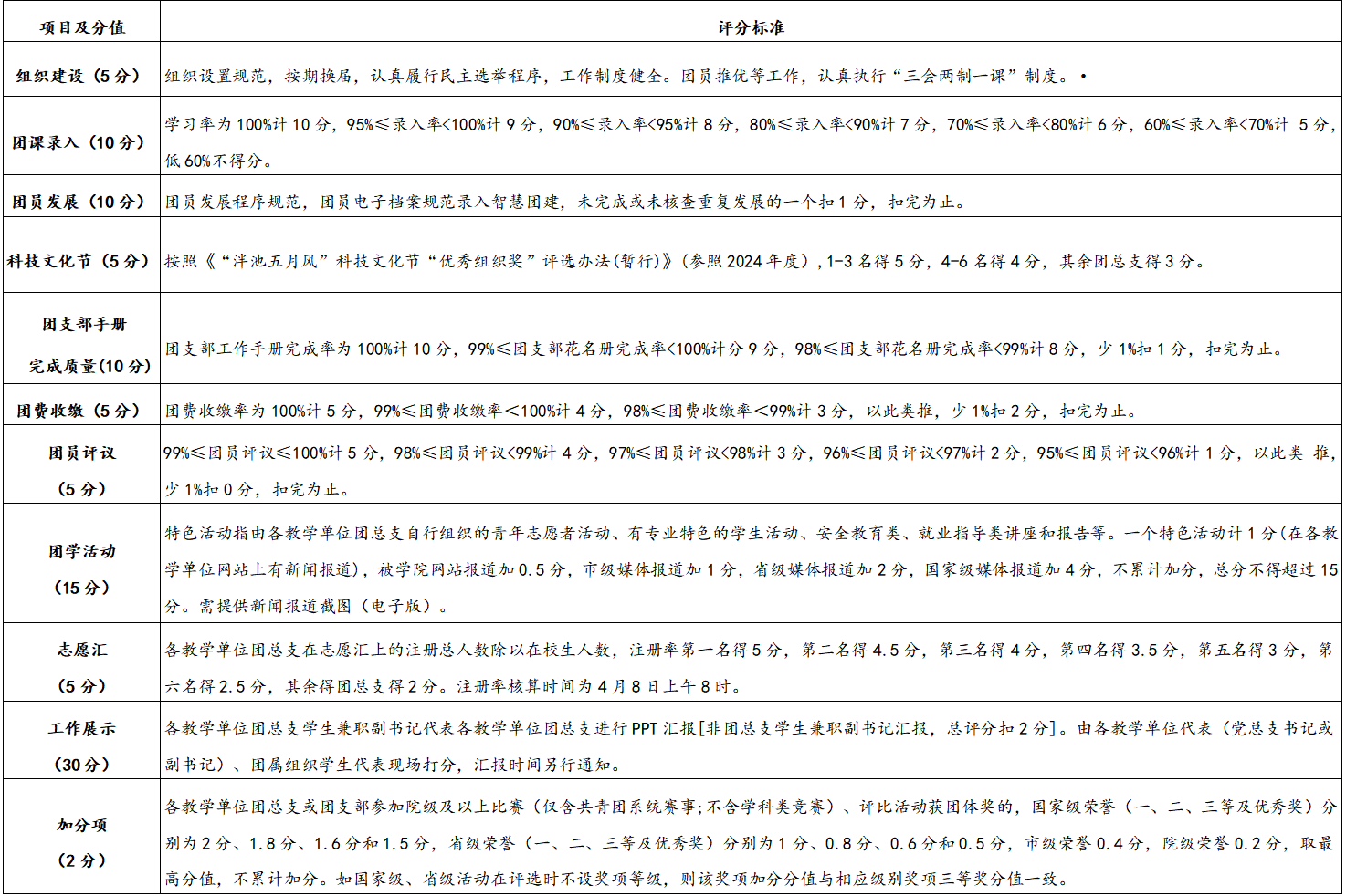 5.各团总支按照“五四红旗团总支”的评选条件和评分细则,认真准备,参加评选,同时需提交申报表和团总支工作总结电子文档各一份。