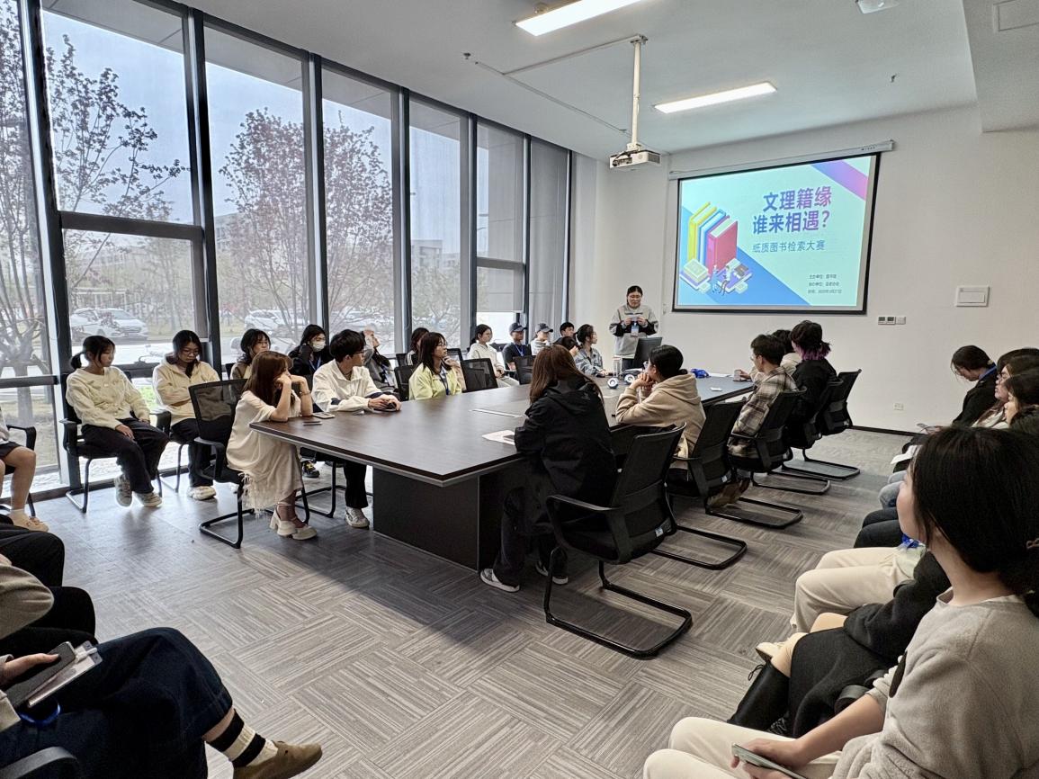 为深化校园阅读文化建设,提升员工信息素养能力,2025年3月27日,由图书馆主办、读者协会协办的“文理籍缘·谁来相遇?”纸质图书检索大赛在图书馆104会议室火热开启。引导近200余名员工深度解锁图书馆资源利用秘籍。