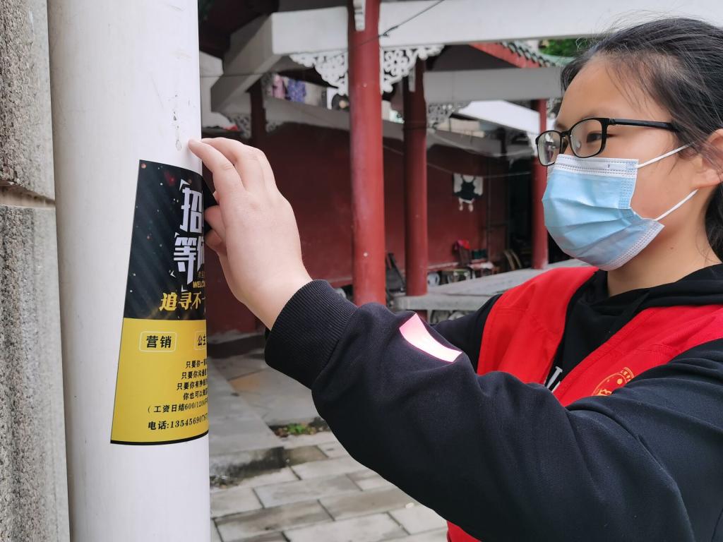 活动中,志愿者们相互配合,积极行动,认真清理每一块“顽固”的小广告。他们细心、耐心的将一张张“牛皮癣”从公司墙上、地上剥离,让校园展露新颜。
