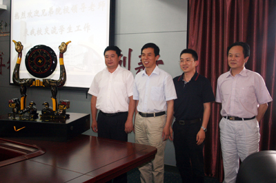 上午,听取了华中师范大学汉口分校副董事长晏永水、学工主任、团委书记的学工经验介绍,下午,在院学工主任彭中同志带领下,同行的其他老师,就员工工作中的一些现实又具体的课题进行了长达三个多小时的深入坦诚的交流,最后汪书记还代表公司向华师汉口分校赠送了虎座鸟架鼓。