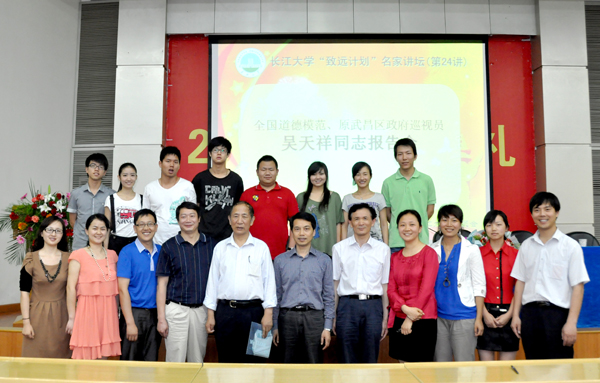 “10•24”英雄集体成员和近300名同学参加了报告会,并与道德模范吴天祥亲切交流。上世纪60年代吴天祥是“五好战士”,70年代是“公安标兵”,80年代是“劳动模范”,90年代先后被授予“全国学雷锋先进个人”、“全国优秀共产党员”和“全国优秀党务工作者”称号。