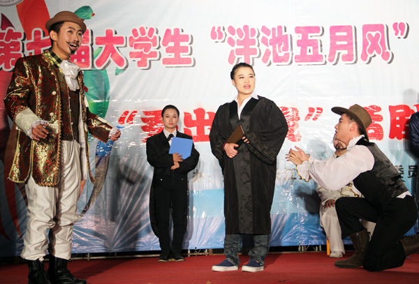 院团委选送的节目《威尼斯商人》,将莎士比亚的经典之作搬上舞台,带给观众们独特的视觉体验。演员们夸张的表情,戏虐的口吻,引得台下观众纷纷起身鼓掌;经典的童话故事《灰姑娘》被赋予了时代的气息,女生们动感的舞蹈,投入的神情及“高富帅、白富美”、“打败你的是无鞋”、“我为自己代言”等新兴网络名词被客串引用到剧本中,引得师生们捧腹不禁。
