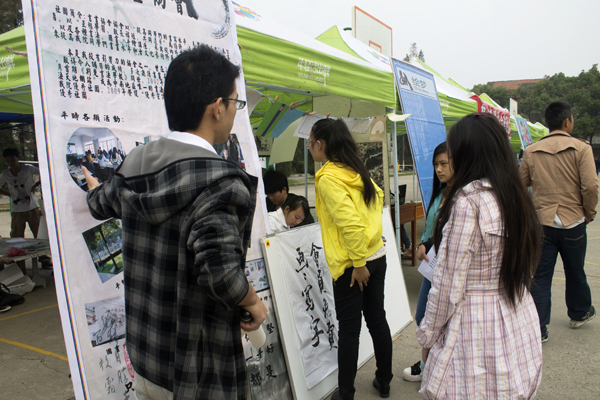 计算机协会的招新平台设在靠近校园正大门的“首位”,协会负责人高调地播放动感音乐,骄傲地向新同学展示技术含量较高的设计成果,让许多爱好者赞叹不已;武术社团则打出强身健体的口号,吸引同学的兴趣;篮球协会不甘示弱,悬挂着超酷的球衣,展板上亮出NBA巨星们的招牌动作,让篮球迷们摩拳擦掌;秋水汉服社里,几位身穿中国传统特色汉服的礼仪小姐一边向同学们展示服装,一边介绍社团优势,她们身上独特的古典韵味让人神往……此外,沙盘社团的沙盘模型,轮滑社摆放的旱冰鞋,羽毛球社陈设的球拍,都吊足了爱好者们的“胃口”。各社团也因这股新鲜血液的注入更显生机与活力。