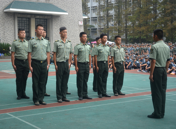 教官代表毛光雨、王明航先后发言,表示在军训期间,会时刻牢记使命、保持军人姿态、服务领导安排、加强沟通交流,出成绩出实效,圆满完成军训任务,全体教官示范表演立正、敬礼、齐步走等基本动作。
