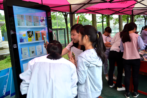 活动现场,图书馆特邀荆州市新华书店携5000种新书进行现场展销,全院师生可在现场选购新书,由图书馆统一订购,也可通过微信平台扫码免费获赠期刊。