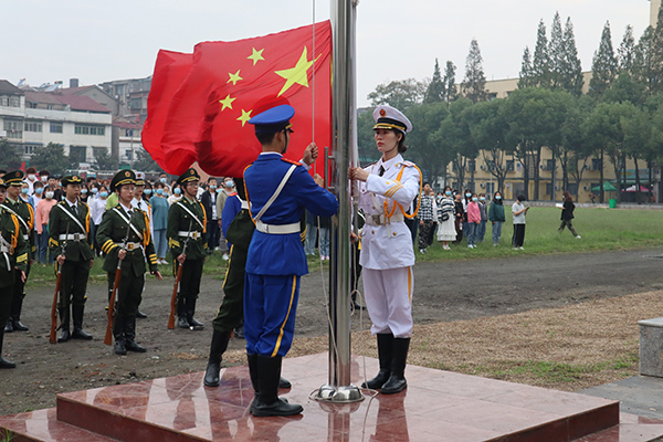 早上7时30分,伴随铿锵有力的脚步声,鲜艳的五星红旗在国庆仪仗队的护送下来到升旗台前。在庄严的国歌声中,五星红旗冉冉升起,飘扬在运动场的上空。全体师生行注目礼,共同祝福伟大的祖国繁荣昌盛,祝愿中华民族昂首走向复兴。