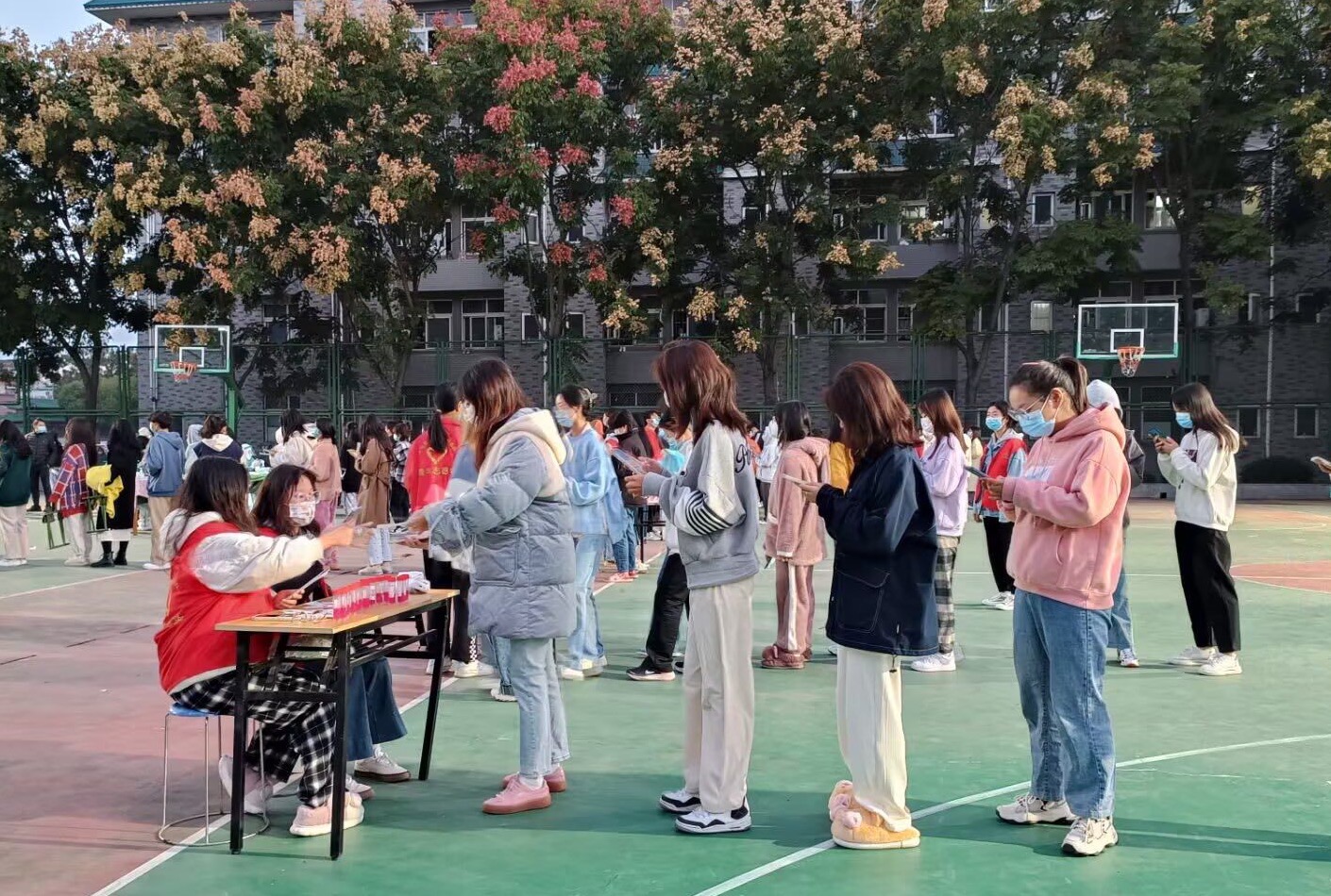 接上级防疫部门紧急通知,10月10日凌晨,公司迅速组织城中校区3000多名在校师生进行第一轮核酸检测,摸排校园人员健康情况。午夜的灯光篮球场上人头攒动,火速赶到现场的公司领导、公司办公室负责人和当天值班老师,同26名身穿红马甲的青年志愿者一起,引导3000多名员工排队,有序进行扫码登记,然后走到核检队伍中,逐一接受核酸采样。
