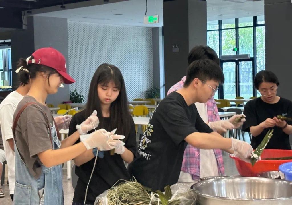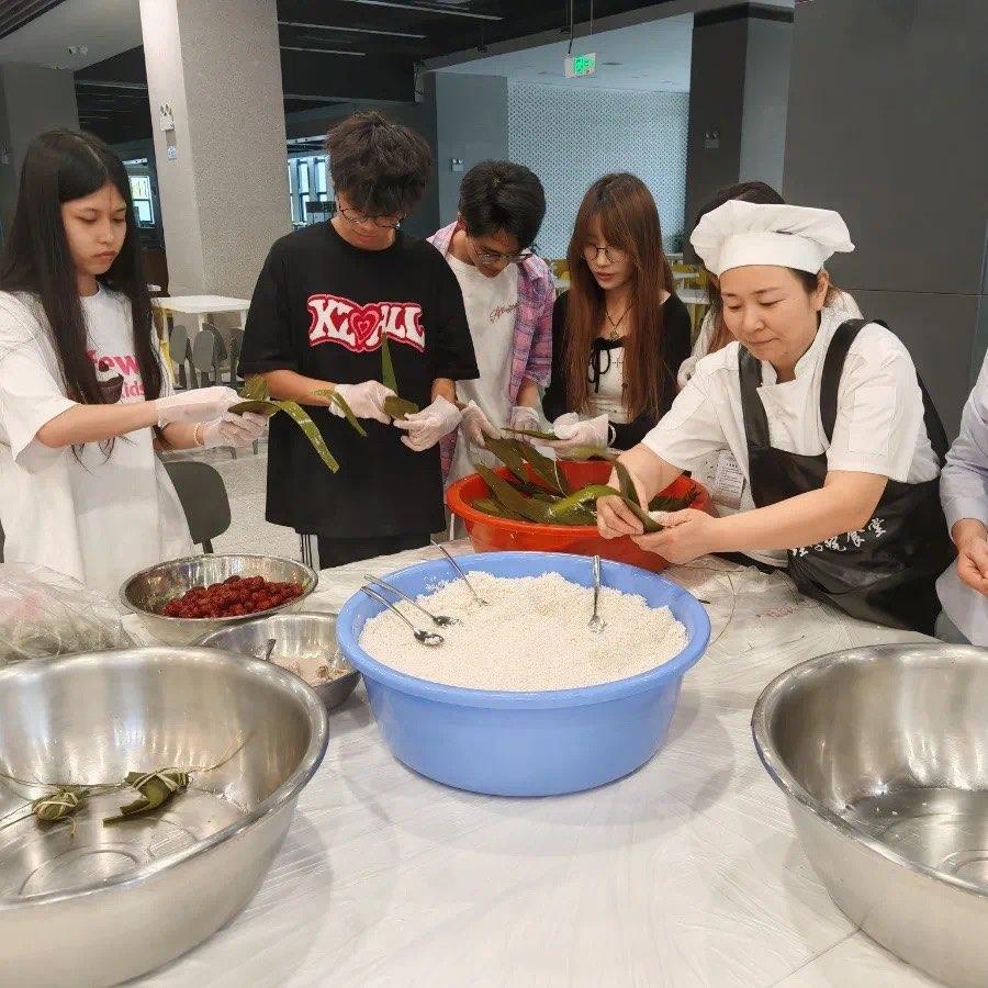 活动现场粽叶飘香,艾草清幽。同学们与食堂工作人员协作配合,卷粽叶、填糯米、捆扎成型,在动手实践中感悟端午民俗;青团制作区笑语盈盈,大家揉面、包馅、塑形,将春日气息融入传统美食。“投壶射礼”“端午知识竞答”等趣味游戏更让现场气氛热烈,传统文化以鲜活形式深入人心。