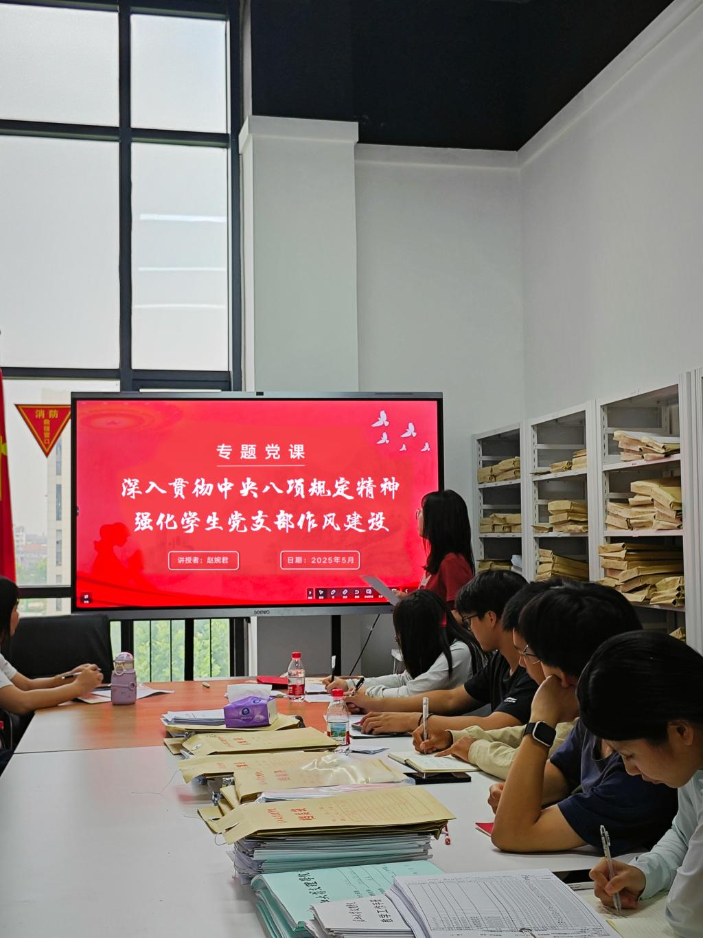 本网讯(通讯员 尧喆豪)2025年5月27日下午4点,体育系员工党支部在会议室开展书记讲授党课,主题为“深入贯彻中央八项规定精神学习教育,强化员工党支部作风建设”。本次党课由体育系员工党支部书记赵婉君主讲,体育系全体员工党员参加了此次学习。