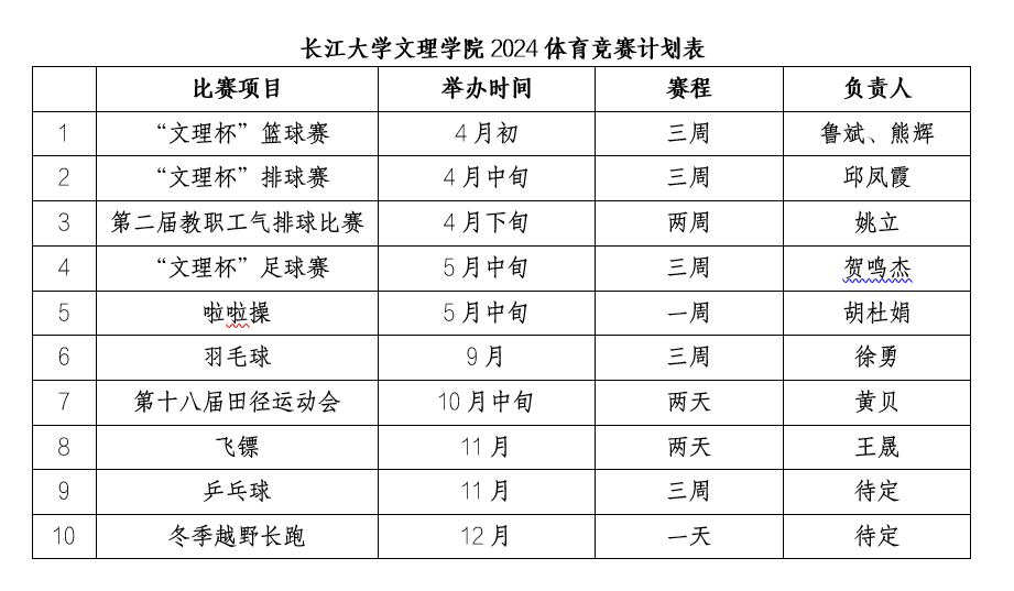 为落实公司“两康一训”重要任务,体育运动委员会在2024年共设有10项校内体育竞赛,分别为“文理杯”篮球赛、“文理杯”足球赛、“文理杯”排球赛、第二届教职工气排球比赛、啦啦操比赛、羽毛球比赛、第十八届田径运动会、飞镖比赛、乒乓球比赛、冬季越野长跑。时间安排如下表(具体时间详见各赛事竞赛规程):