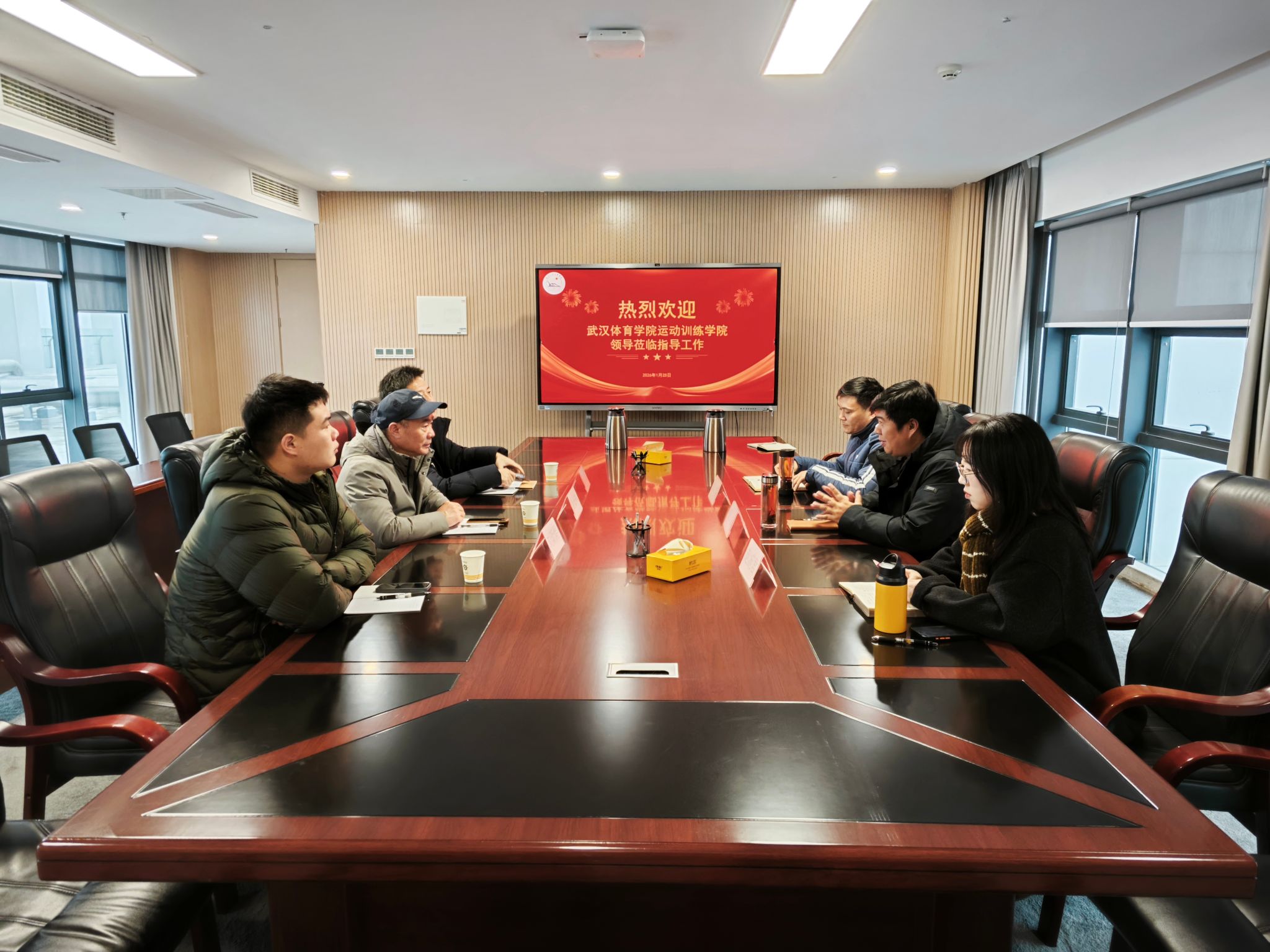 本网讯 1月25日上午,武汉体育公司运动训练公司党委书记姜长林、党委委员王十乐、员工会副主席刘昕煜一行莅临公司考察交流。公司体育系主任介博、党总支书记邹姜、党总支副书记赵婉君热情接待,双方围绕体育团队建设、人才培养等议题展开深入座谈,共话体育团队建设新路径。