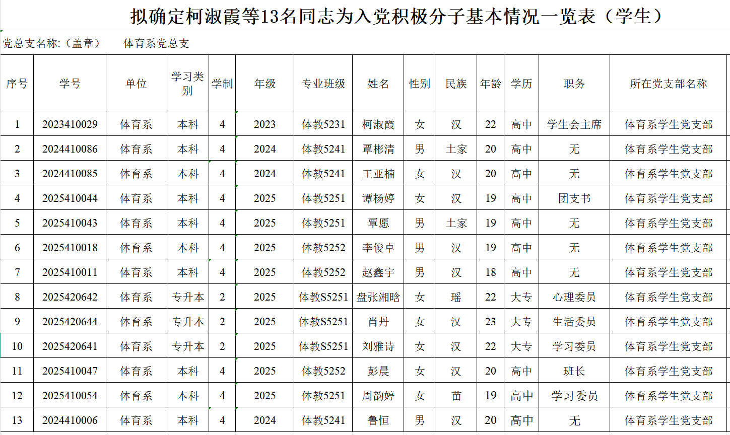 根据党员推荐和团组织推优情况,经支部委员会会议讨论决定并报党委备案,确定柯淑霞等13名同学为入党积极分子,现予以公示。公示时间:2026年3月9日至2026年3月14日(公示时长一般为5个工作日)。