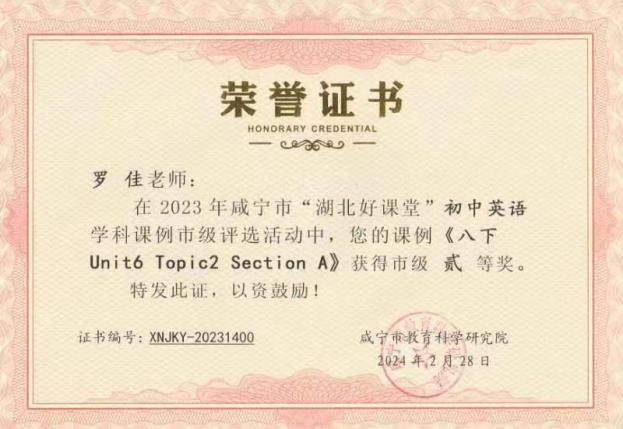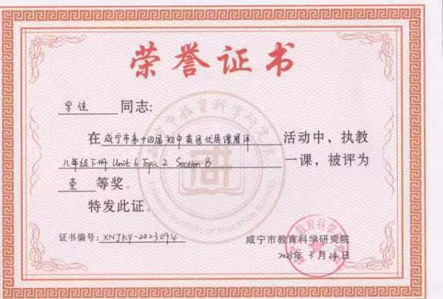 罗佳,bw必威西汉姆联官方网站bw必威西汉姆联官方网站2004级英语专业504103,2008届毕业生。现就职于湖北省咸宁市通城县五里镇五里中学。曾荣获咸宁市第十四届初中英语优质课课件市级一等奖,咸宁市“湖北好课堂”初中英语学科课例市级二等奖等各项荣誉。
