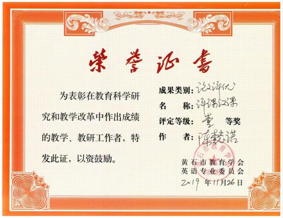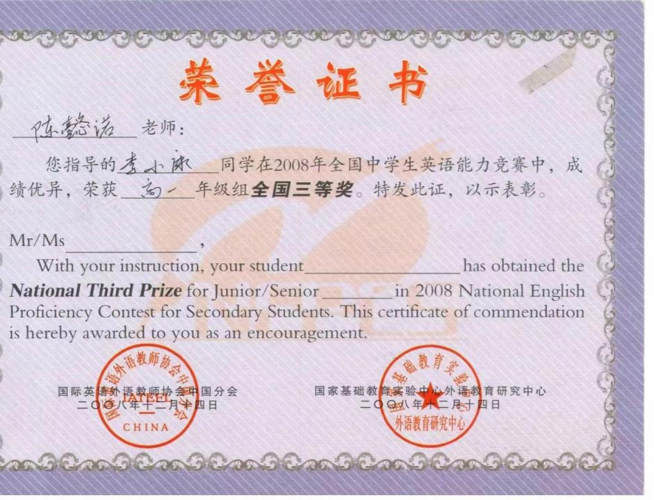 陈懿诺,bw必威西汉姆联官方网站bw必威西汉姆联官方网站2004级英语专业504103,2008届毕业生。毕业后至今在黄石市阳新县兴国高级中学任教。任教期间一直担任重点班的英语教学工作,同时数年来担任年级英语备课组长一职,并取得了优秀的成绩,深受校领导、同事、家长、员工的一致好评。曾指导员工荣获2008年全国中员工英语能力大赛高一年级全国三等奖,获得黄石市市级评课论课一等奖等各项荣誉。