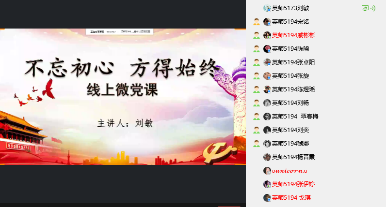 4月24日下午,刘敏同学为英师5194班团支部开了一节“不忘初心 方得始终”的线上微党课。从以下三个方面进行了讲解,一、忆初心。忆初如故,勿忘初心,我们应当想起自己最初追求的目标,想起自己入党的初衷,无论世事如何变迁, 始终记住最初的自己,不要迷失自己的本性和梦想。二、明职责。明确职责是为了更好的承担责任。在社会中,我们背负着许多责任,身为儿女应当孝敬父母,身为一名党员应当认真履行党员义务,自觉加强理论学习,不断提高思想认识。三、当先锋。“勇当先锋、做好表率”是保持共产党员先进性的必然要求,作为党员应当充分发挥先锋模范作用,用正确的理论武装头脑,用丰富的知识完善自己,始终保持共产党员的先进性。