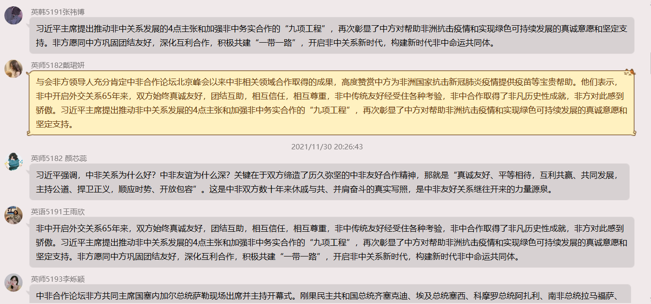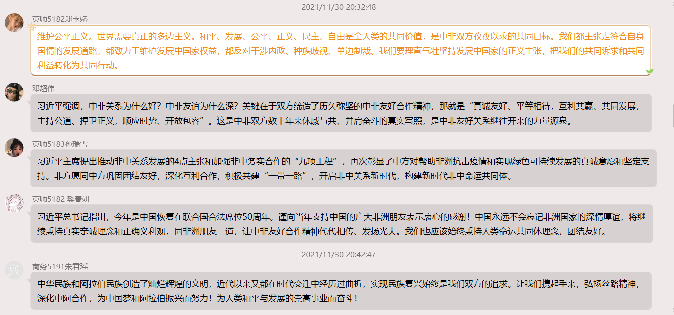 11月30日学习内容以“习近平总书记发表题为《同舟共济,继往开来,携手构建新时代中非命运共同体》的主旨演讲。习近平总书记就构建新时代中非命运共同体提出4点主张。第一,坚持团结抗疫。要坚持人民至上、生命至上,弘扬科学精神,支持疫苗知识产权豁免,切实保障疫苗在非洲的可及性和可负担性,弥合“免疫鸿沟”。第二,深化务实合作。要扩大贸易和投资规模,共享减贫脱贫经验,加强数字经济合作,促进非洲青年创业和中小企业发展。欢迎非洲国家积极支持参与全球发展倡议。第三,推进绿色发展。要倡导绿色低碳理念,积极发展太阳能、风能等可再生能源,推动应对气候变化《巴黎协定》有效实施,不断增强可持续发展能力。第四,维护公平正义。世界需要真正的多边主义。和平、发展、公平、正义、民主、自由是全人类的共同价值,是中非双方孜孜以求的共同目标。我们都主张走符合自身国情的发展道路,都致力于维护发展中国家权益,都反对干涉内政、种族歧视、单边制裁。我们要理直气壮坚持发展中国家的正义主张,把我们的共同诉求和共同利益转化为共同行动。