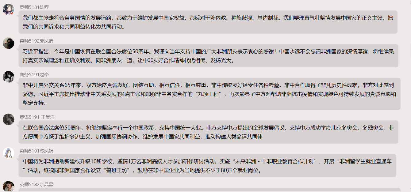 在本次学习中,党员同志们积极踊跃发言:中国作为世界最大的发展中国家,非洲作为世界发展中国家最集中的大陆,中非间的守望相助和发展共赢不仅极大地助力了全球减贫和发展事业,而且推动了全球治理体系和国际秩序变革朝着更加开放包容和公平正义的方向发展。经过几十年辛勤浇灌,中非合作已经枝繁叶茂,成长为参天大树,任何力量都无法撼动。