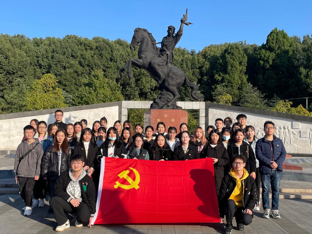 第二站,贺炳炎纪念广场。在这里,党支部举行隆重而庄严的纪念仪式。首先,由田蕊同志朗诵《长征精神》以歌颂先辈革命精神,并在先辈雕像前许下接过历史重任的承诺。接着,党员同志们集体默哀,以表达对革命先辈的无限追思。党员同志们向先辈雕像鞠躬,向将军致敬!最后,党员同志们庄严宣誓,宣誓声音响彻云霄。