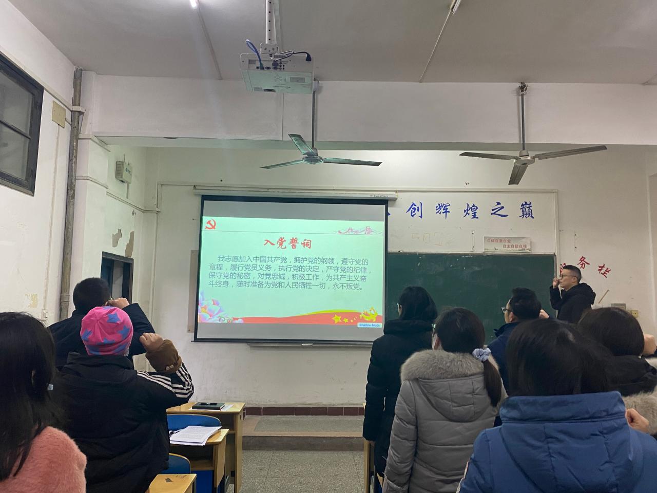 随后,党员教师开展支部主题党日活动。刘鋆锋副书记带领全体党员重温入党誓词,党员教师集体诵读党章第五章,学习习近平总书记在中共中央政治局民主生活会上的重要讲话;习近平总书记在中央全面依法治国工作会议上的重要讲话;和中共湖北省委十一届八次全体会议精神。