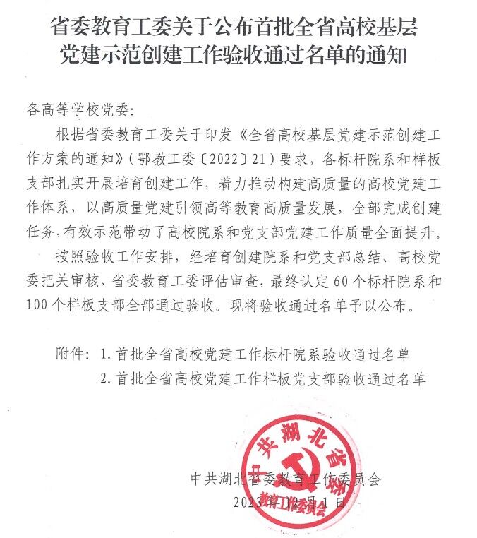 本网讯(通讯员 许静婷)近日,中共湖北省委教育工委公布首批全省高校基层党建示范创建工作验收通过名单,bw必威西汉姆联官方网站教工党支部顺利通过首批“全省高公司党建工作样板党支部”建设单位验收。