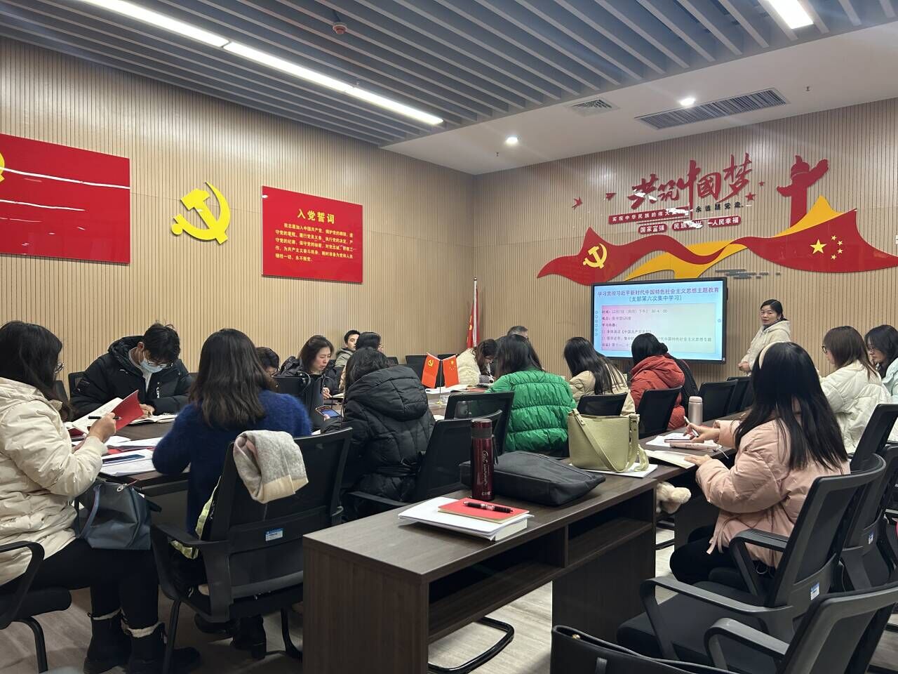 会上,付老师带领全体党员研读了《中国共产党章程》、《习近平新时代中国特色社会主义思想专题摘编》第十一、十二部分。集中学习“坚持在发展中保障和改善民生”、“坚持人与自然和谐共生”相关内容。