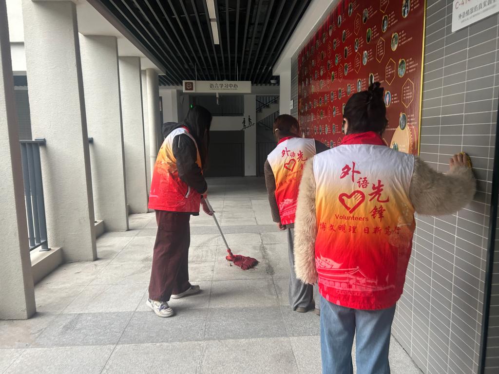 党员同志们身着志愿服,手持清洁工具,按照区域划分迅速集结,不怕脏、不怕累,细致入微地清理着校园地面墙面,不放过每一个死角。