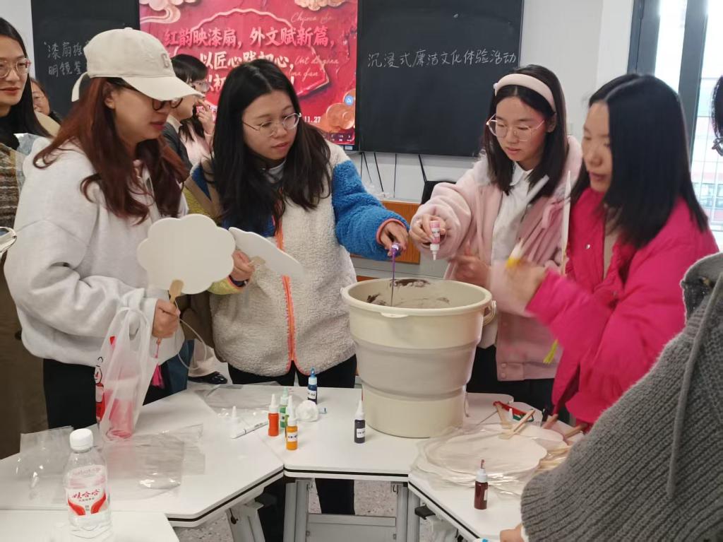 本网讯(通讯员 黄孝乂爻)2025年11月27日下午,bw必威西汉姆联官方网站全体师生党员于实验楼C414教室开展“红韵映漆扇 外文赋新篇”主题党日活动,以传统漆扇工艺为载体,让红色学习与非遗传承深度融合。