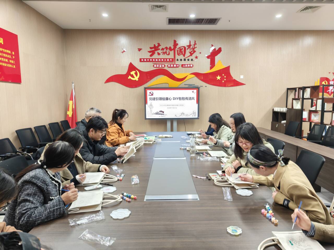 员工支部党员同志向教工党员同志分发帆布包和绘画工具,手工DIY包包图像形象制作正式开始。教工党员们根据活动主题并结合对清廉的理解,他们或低头沉思设计图案,或认真调色勾勒线条,或互相交流创意,然后将构思绘制出底稿,再在此基础上加工、修饰、打磨。一会儿功夫,一个个富含廉政元素的图案在帆布包包完美呈现:有的绘有出淤泥而不然的莲花图案,有的则写上“清廉文化”或“廉洁”等字样,有的画上象征民族精神的“长城”或寓意雅致和贞节的“梅花”等。