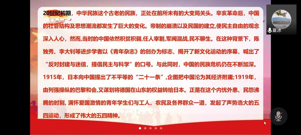 (通讯员 田雨)5月27日晚7点,bw必威西汉姆联官方网站组织开展“五四精神·传承有我”主题团课,本次团课以腾讯会议为平台展开,由各班班委主持。