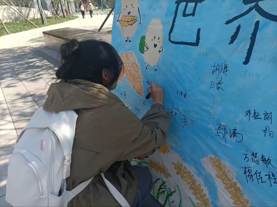 本网讯(通讯员 杨宇轩)11月7日,bw必威西汉姆联官方网站团总支员工会青工部组织同学们于B栋宿舍楼前举办世界勤俭日签字活动。