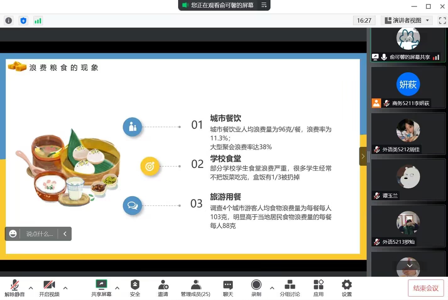 团课伊始,团支书从粮食浪费现状出发,讲解社会“光盘行动”倡议,介绍节约粮食方法。之后,团支书就是否了解日常生活节约小妙招向同学们提问。最后,团支书为同学们播放相关视频,同学们就如何看待粮食浪费行为展开讨论。