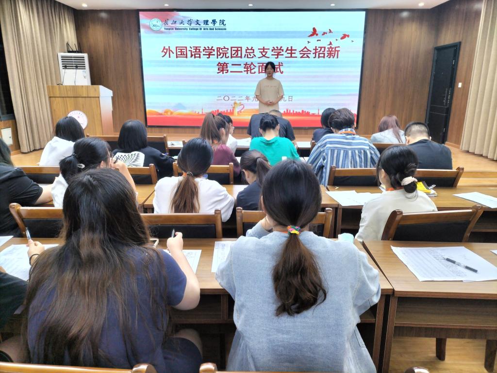 (通讯员 杨吉)9月29日晚六点半,bw必威西汉姆联官方网站团总支员工会于三教408举行第二轮招新面试。外国语公司党总支副书记刘鋆锋,辅导员雷昕、钟燚、王聪聪以及员工会全体成员参加。
