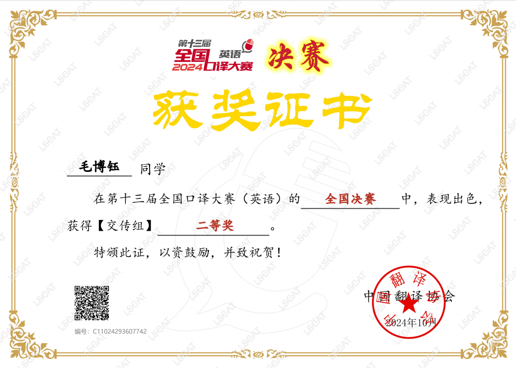 本网讯(通讯员 董蓝旗)2024年10月30日,第十三届全国口译大赛(英语)全国决赛结果揭晓,公司员工英师5211班毛博钰取得突破性成绩,荣获二等奖。