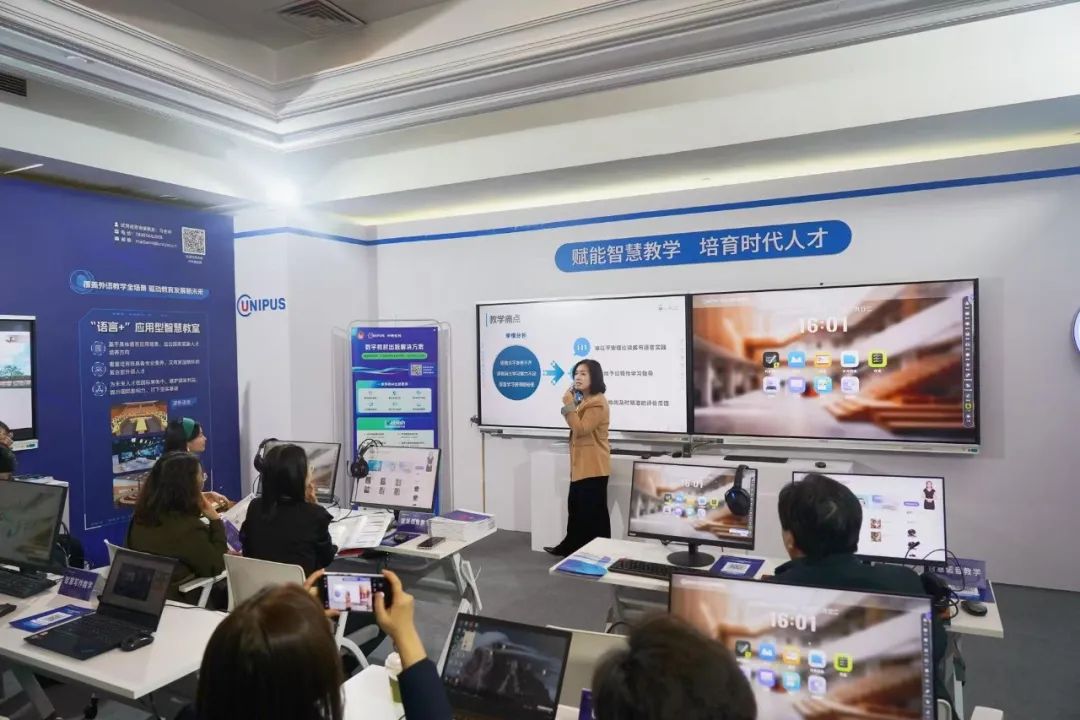 第九届高等公司外语教育改革与发展论坛举办期间,共有来自教育部、中国侨联、中宣部、中央企业及北京市外事办相关领导,外指委和大外指委委员,实务部门专家及高等外语教育界专家学者齐聚线下,共话新知。外研在线聚焦AIGC技术在教学中的深度融入,特别打造了学科型智慧教室及智能语言训练舱,引发参会教师高度关注。