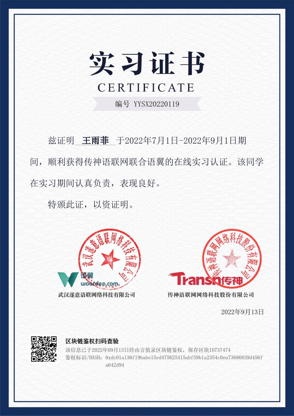 翻译实习项目在传神公司“语翼”翻译平台上开展,通过测试的同学可成为“译推官”,接收系统分配的轻任务,任务完成后获得个人积分。本次实习共有207名同学参加,其中武星星、曾羌笛、赵安勇等17名同学完成300单以上轻任务;王雨菲、杨万红、伍远兵等74名同学完成60单以上轻任务。传神公司为员工分别颁发“优秀实习生”荣誉证书和实习证书。