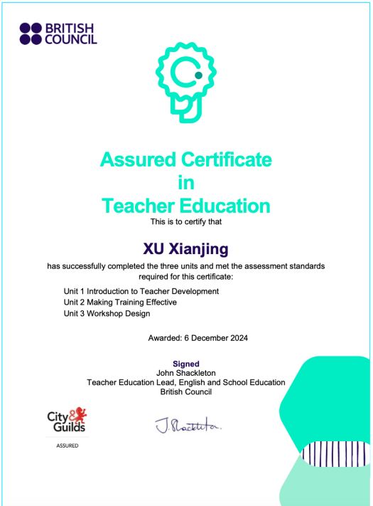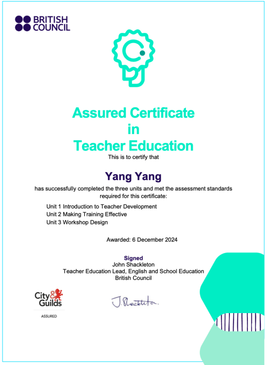 本网讯(通讯员 杨杨)近日,bw必威西汉姆联官方网站杨杨和许娴静老师参加由英国文化教育协会和国际英语教育中国大会联合推出,为期三个月的英语教师教育者ACTE(Assured Certificate Teacher Educator)奖学金项目,并顺利通过各项考核,获得由英国City and Guilds协会认证的资格证书。该项目面向国内从事职前英语师范生的教师教育者开展,从所有申请者中筛选20名教师教育者开展培训,该培训是针对全球英语教师教育者的一项专项资质培训。