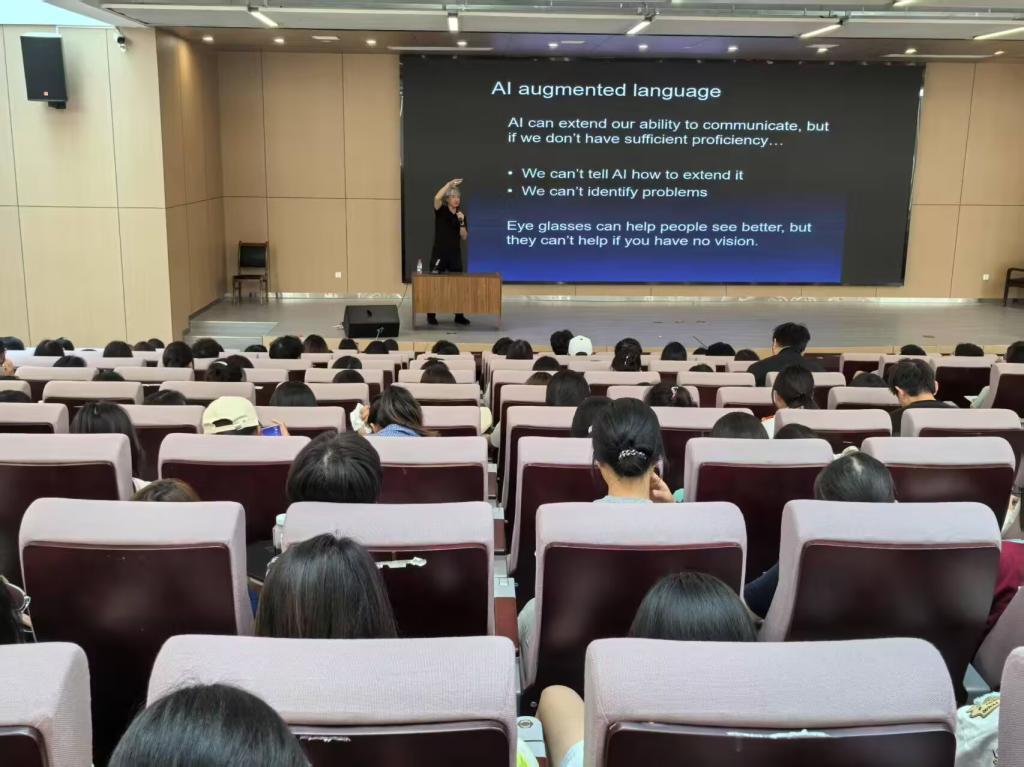 针对“AI 是否会取代语言学习”争议,松田教授以“眼镜辅助视力”类比,指出 AI 需以使用者基础语言能力为前提,人类语言知识与批判性认知不可替代。他引入“增强表现”概念,详解 AI 在语言学习各环节的辅助作用,并以英语写作举例,阐述培养“适配 AI 的语言能力”策略。谈及教师角色,松田教授强调教师应推动 AI 合理使用,做好场景设计、评估支持与资源示范。互动环节中,松田教授结合实例解答提问,现场气氛热烈。