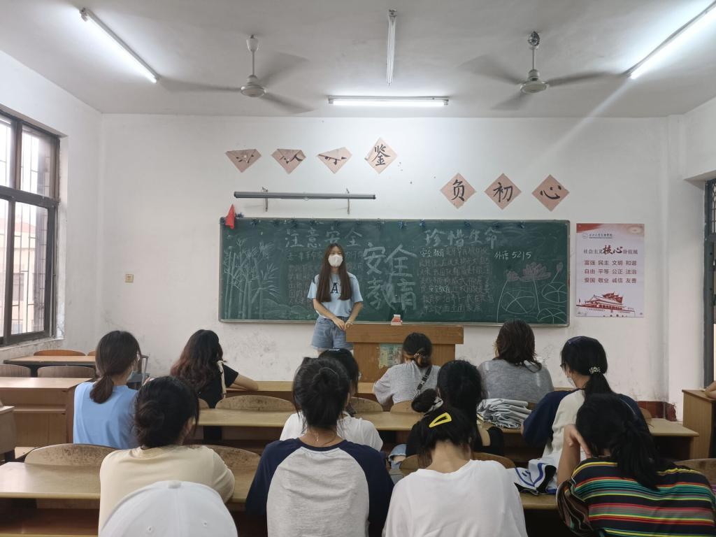 班会主要围绕卫生、溺水、消防、诈骗四个方面展开。班会伊始,班委讲述每年生活中的真实案例,强调安全防范意识的必要性,并叮嘱日常生活中要注意远离危险水域、注意宿舍用电安全。随后,播放相关短视频,警醒大家时刻保持清醒,严防诈骗,不要以身犯险。