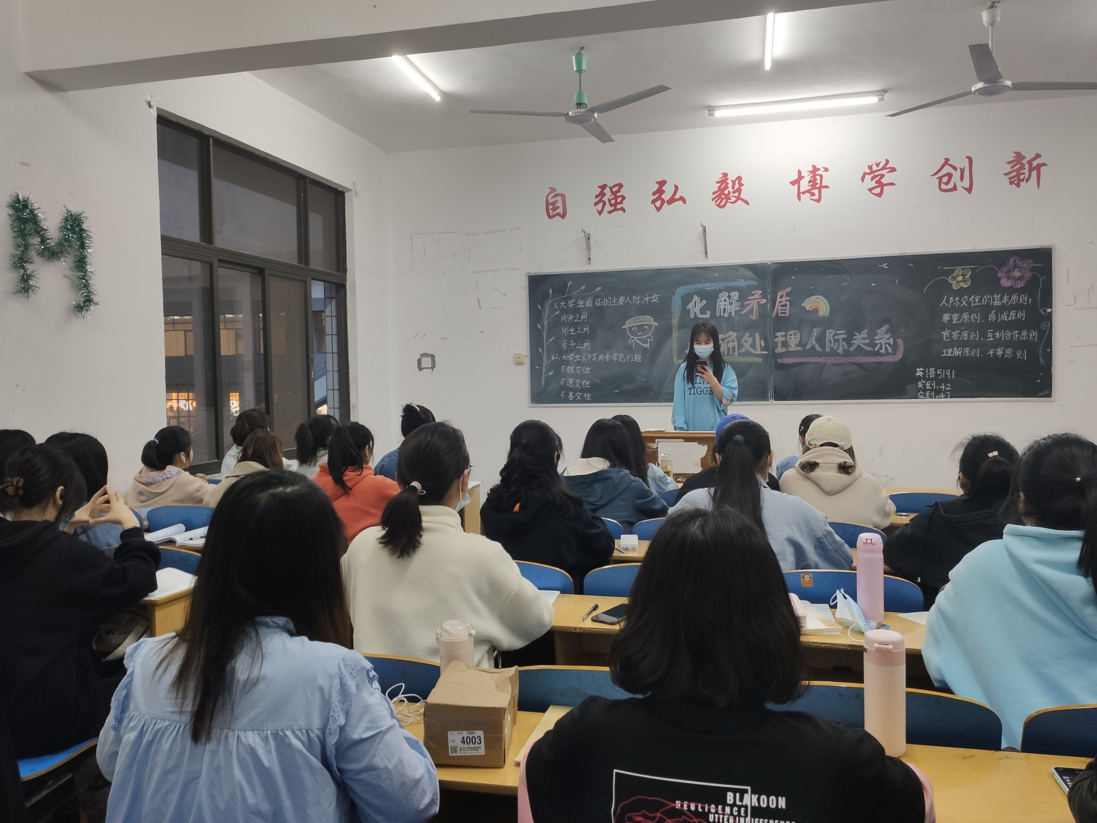 班会伊始,班委通过举例引出防范人际关系冲突这一主题,并提出其重要性:人际交往不仅是员工交流信息的重要途径,更是个体认识自我的重要手段。接着,班委就“如何防范人际关系冲突?”这一问题发起讨论,同学们表示如果每个人都多一份真诚、多一些赞美,学会尊重、学会倾听、主动沟通,许多误会便会迎刃而解。