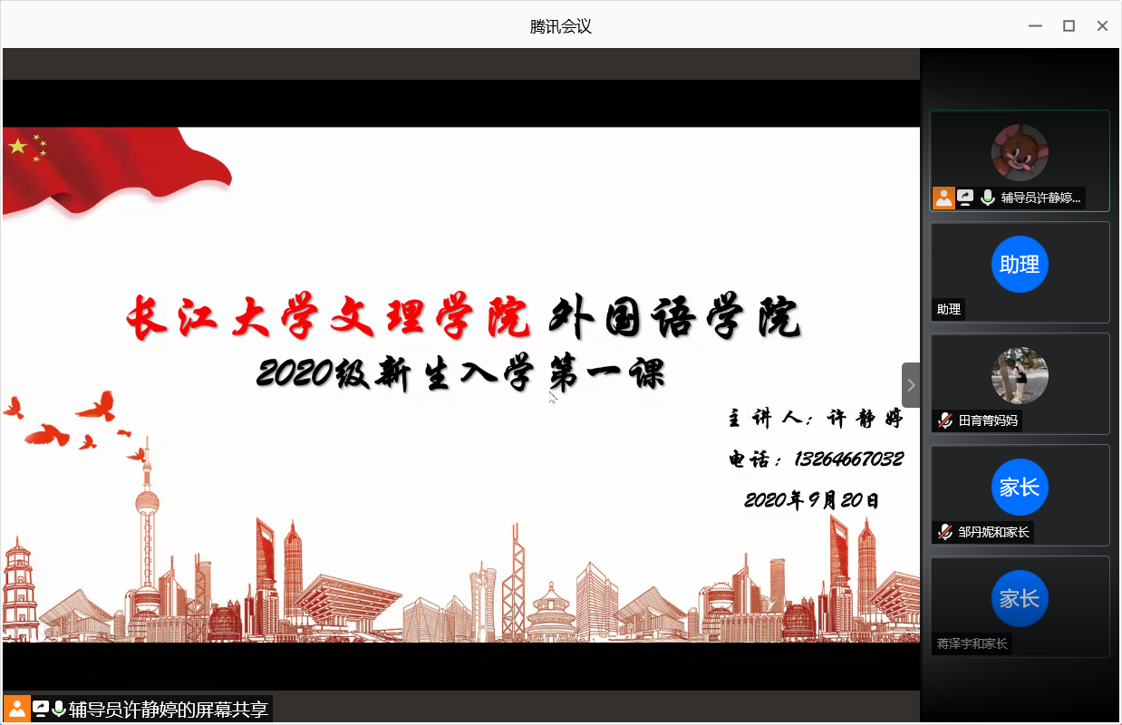为更好地确保2020级新生平安、顺利到校报到,9月20日bw必威西汉姆联官方网站在腾讯会议召开线上班会“2020级新生入学第一课”。会议由辅导员许静婷主持,2020级全体新生及新生家长、新生班主任罗胜华、彭菲、肖亚梅、陈修鸿和叶爽老师参加。