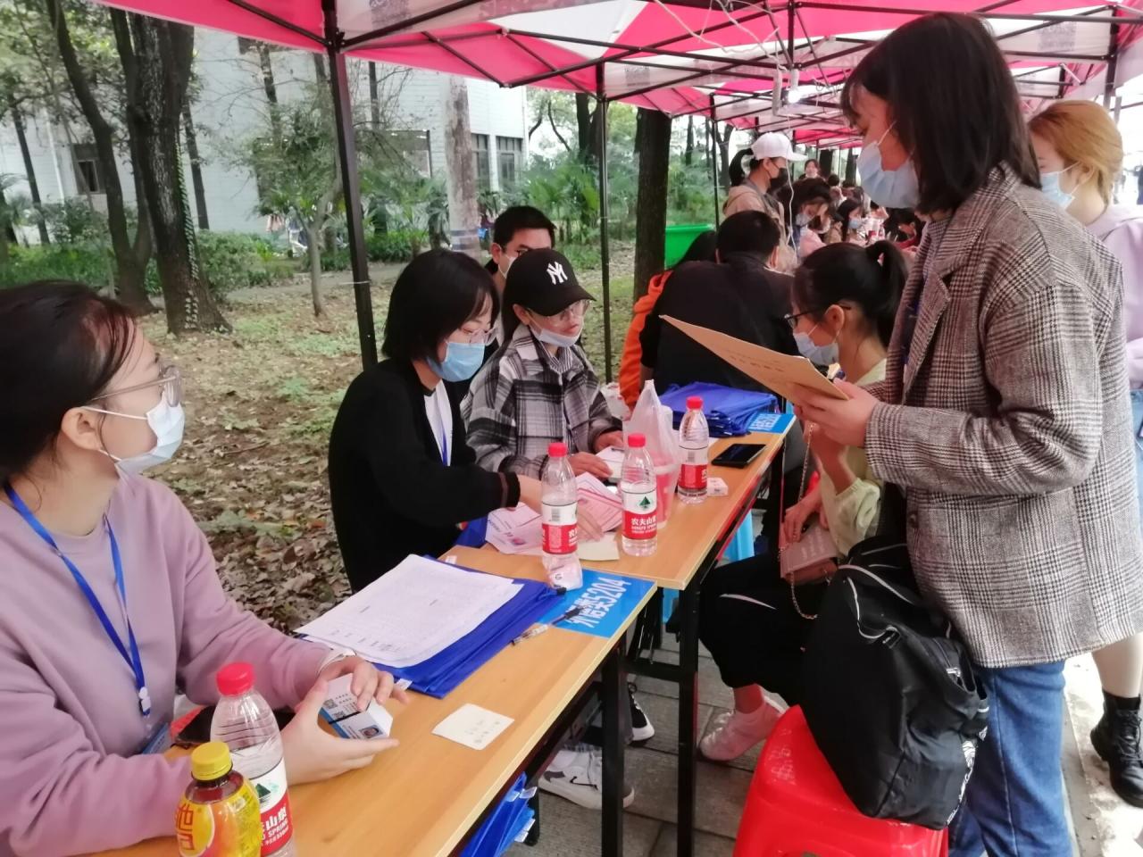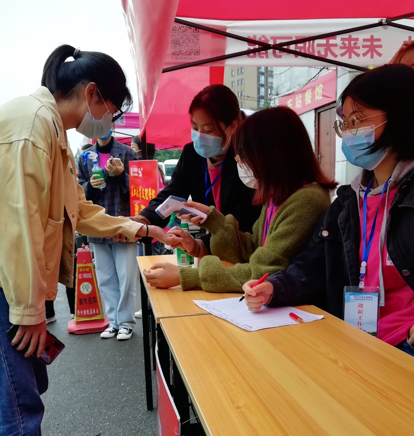 迎新过程中,新生接待处的员工会成员们热心服务,耐心指导,帮助新生熟悉校园环境;在军训服分发点,各位员工干部与志愿者分工合作,团结一致进行分发工作。